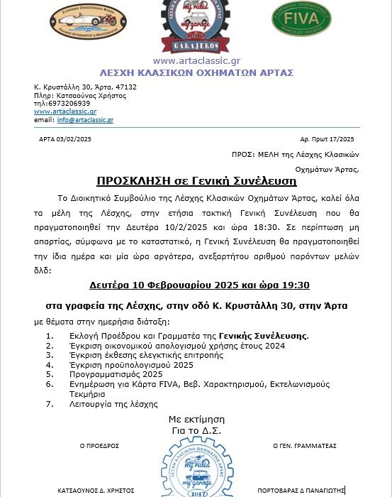 6973206939, 6937427005, 6974993974 ή μέσω της σελίδας μας στο Facebook και του site www.artaclassic.gr.