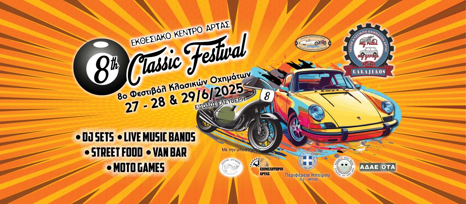 Η Λέσχη Κλασικών Οχημάτων Άρτας ανακοινώνει την διοργάνωση του 8ου Φεστιβάλ Κλασικών Οχημάτων στην πόλη της Άρτας. Σε νέα ημερομηνία καθώς η εκδήλωση μετακινείται στο τέλος Ιουνίου περιμένουμε όλους τους φίλους του κλασικού-ιστορικού οχήματος για ένα τριήμερο γεμάτο δραστηριότητες-συναυλίες-street food- bar van μα πάνω απ’όλα την καλύτερη διάθεση όλων. Το πρόγραμμα της εκδήλωσης θα ανακοινώνεται σταδιακά τις επόμενες ημέρες