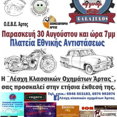 6o Φεστιβάλ Κλασικού Οχήματος 25-26 Αυγούστου 20231 Photo 5η Έκθεση Κλασικών Οχημάτων 26-27 Αυγούστου 20221 Photo Vespa Night 13 Ιουλίου 20221 Photo Βόλτα Παραποτάμιο Πάρκο Νεοχωρίου Άρτας 8 Ιουλίου 2022 4η Έκθεση Κλασικών Οχημάτων 27 Αυγούστου 20211 Photo Εκδρομή στο Βουργαρέλι 13 Σεπτεμβρίου 2020Εκδρομή στη Ροδαυγή 14 Ιουνίου 2020 3η Έκθεση Κλασικών Οχημάτων 30 Αυγούστου 20191 Photo 2η Έκθεση Κλασικής Μοτοσικλέτας 23 Αυγούστου 20181 Photo Page 1 Page 2 Next→